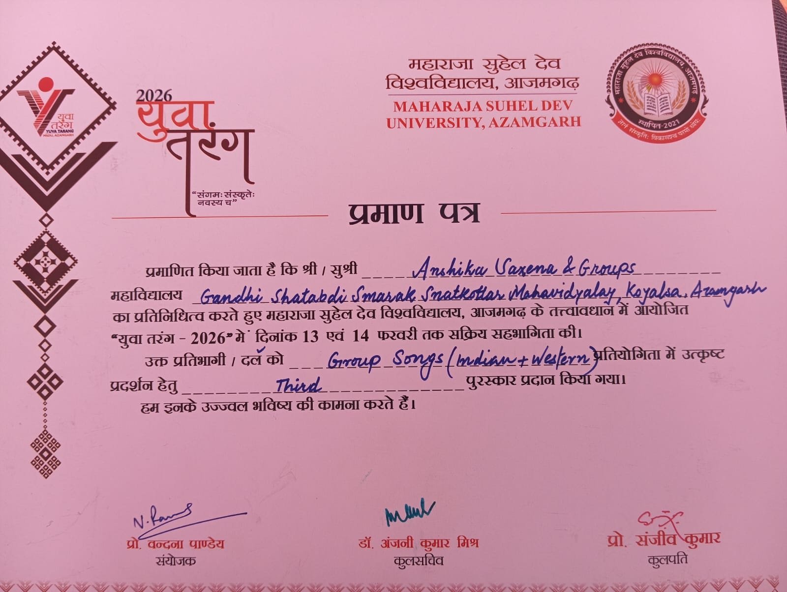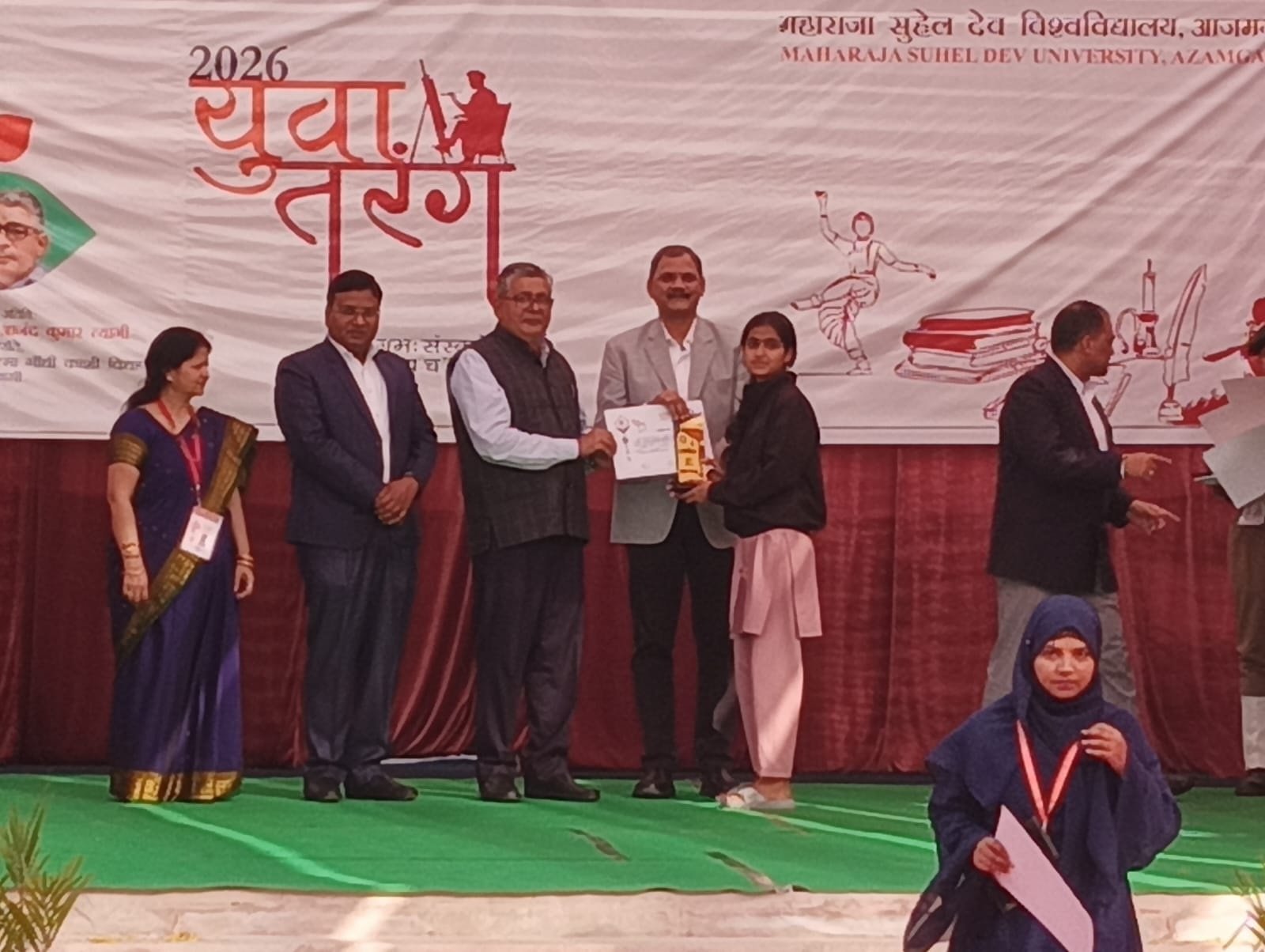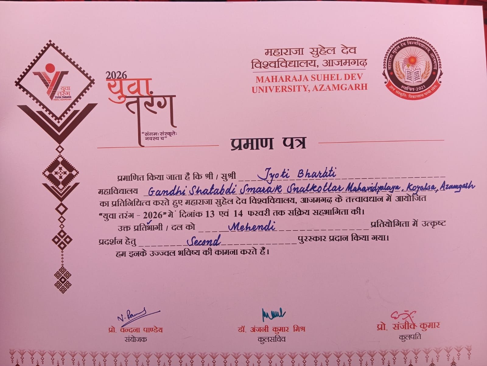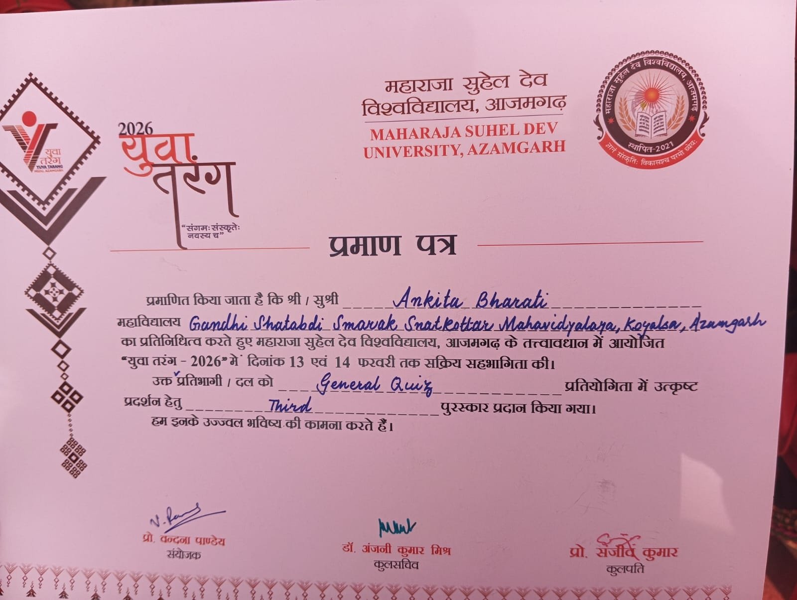 महाराजा सुहेल देव विश्वविद्यालय, आजमगढ़ के प्रथम सांस्कृतिक कार्यक्रम "युवा तरंग- 2026" में गांधी शताब्दी स्मारक स्नातकोत्तर महाविद्यालय, कोयलसा, आजमगढ़ की टीम ने विभिन्न प्रतियोगिताओं में दिनांक 13-14 फरवरी को प्रतिभाग किया। महाविद्यालय की ज्योति भारती को मेहंदी प्रतियोगिता में द्वितीय स्थान, समूह गायन "भारतीय और पाश्चात्य" में अंशिका सक्सेना, अर्चना भारती, प्रतिभा यादव, अंतिमा विश्वकर्मा, जागृति सिंह और आकांक्षा यादव की टीम को तृतीय स्थान और सामान्य ज्ञान प्रश्नोत्तरी (क्विज) में अंकिता भारती को तृतीय स्थान प्राप्त हुआ।
