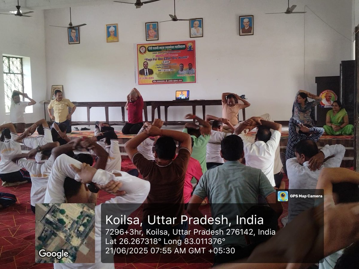 आज दिनांक 21 जून 2025 को गाँधी शताब्दी स्मारक स्नातकोत्तर महाविद्यालय कोयलसा आजमगढ़ के प्रांगण में अन्तर्राष्ट्रीय योग दिवस के अवसर पर सुबह 07:00 बजे से योग शिविर का आयोजन किया गया जिसमें प्रशिक्षक के रूप में श्री अमित सिंह जी नें अपना योगदान दिया , इस शिविर में महाविद्यालय के प्राचार्य डॉ स्वस्तिक सिंह, डॉ धीरेन्द्र कुमार गुप्ता, डॉ अनुराग मिश्र, डॉ दुष्यन्त त्रिपाठी, डॉ धीरेन्द्र मिश्र, डॉ संदीप कुमार, डॉ संजय पटेल, डॉ साधना राय, डॉ संजना, डॉ संगीता मिश्रा, डॉ सोनी, श्री दिनेश पाण्डेय, श्री गणेश प्रसाद एवं समस्त स्टाफगण एवं छात्र-छात्राएं उपस्थित रहें ।